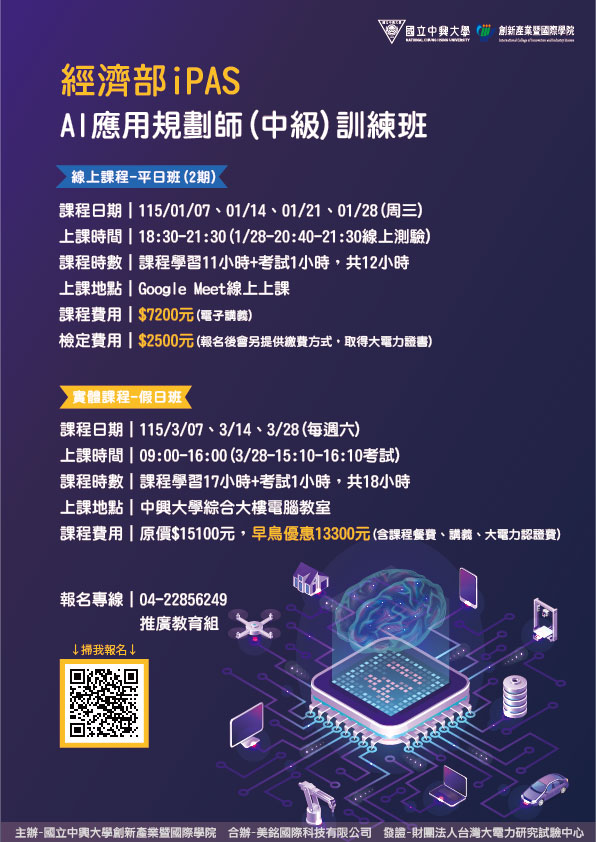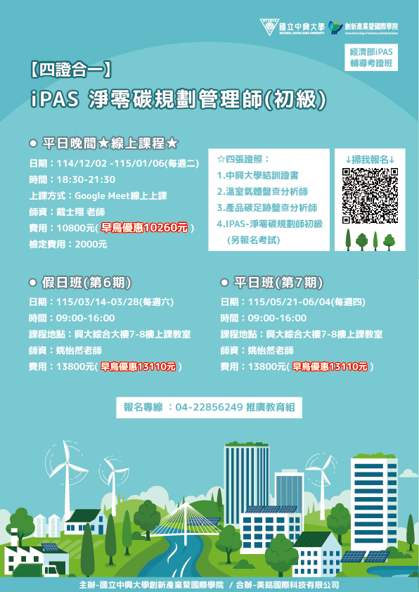 國立中興大學辦理「四證合一-經濟部 iPAS 淨零碳規劃管理師(初級)輔導考證班、經濟部iPAS-AI應用規劃師(初級、中級)輔導訓練班」招生訊息