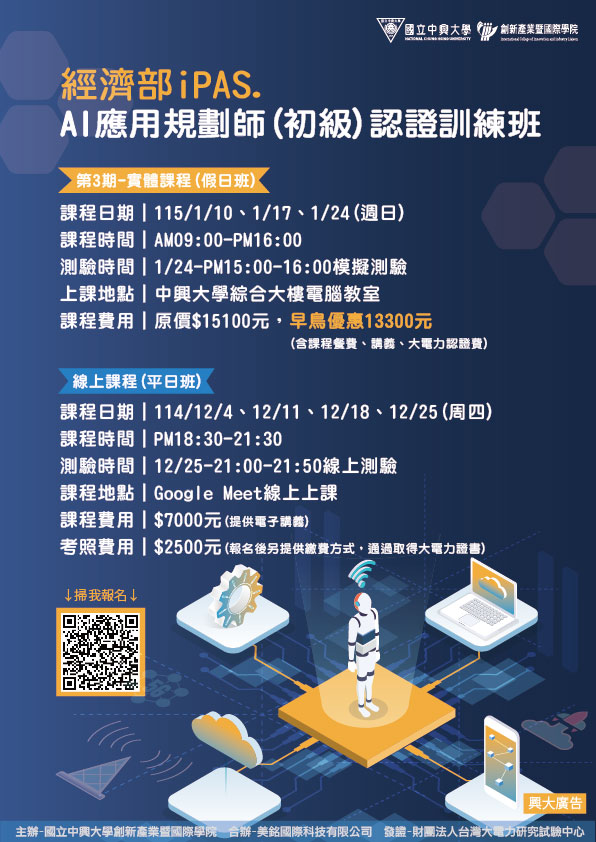 - 上傳附件-01: 國立中興大學辦理四證合一-經濟部_iPAS_淨零碳規劃管理師初級輔導考證班經濟部iPAS-AI應用規劃師初級中級輔導訓練班招生訊息1141021.PDF